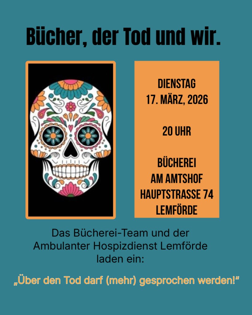 Wir (das Bücherei-Team, Silvia Lange und der Ambulante Hospizdienst Lemförde) merken, dass euch diese Themen bewegen und somit freuen wir uns auf einen weiteren Abend mit Büchern, Geschichten und Gesprächen in der Bücherei am Amtshof, Hauptstraße 74, Lemförde.